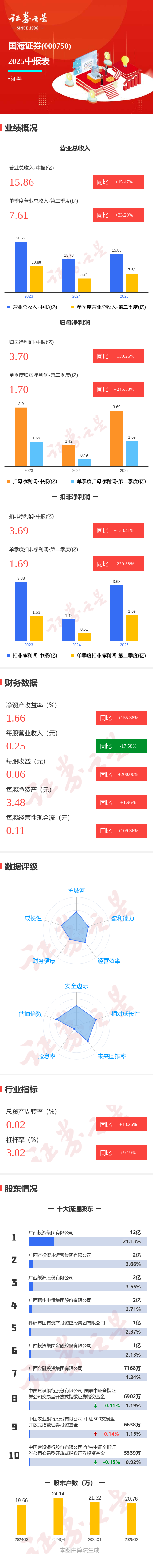 证券之星消息,国海证券2025年中报显示,公司主营收入15.86亿元,同比上升15.48%;归母净利润3.7亿元,同比上升159.26%;扣非净利润3.69亿元股票配资排排,同比上升158.41%;其中2025年第二季度,公司单季度主营收入7.61亿元,同比上升33.21%;单季度归母净利润1.7亿元,同比上升245.59%;单季度扣非净利润1.69亿元,同比上升229.38%;负债率66.84%,投资收益4.46亿元。