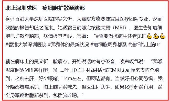 吴文忻直言她做了核磁共振等各项检查,医生告诉她,她的癌细胞已经扩散到大脑,而且左右脑都有。